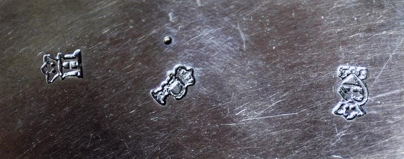 Poinçon de maître : écu couronné en forme de coeur portant les armes de la ville de Dijon, lettres J B dessous ; communauté de Dijon, 1783-1784 : lettre H couronnée ; charge des gros ouvrages, juridiction de Dijon, 1781-1789 : lettre P fleuronnée et couronnée ; décharge des menus ouvrages, juridiction de Dijon, 1781-1789 : une tête d'enfant.