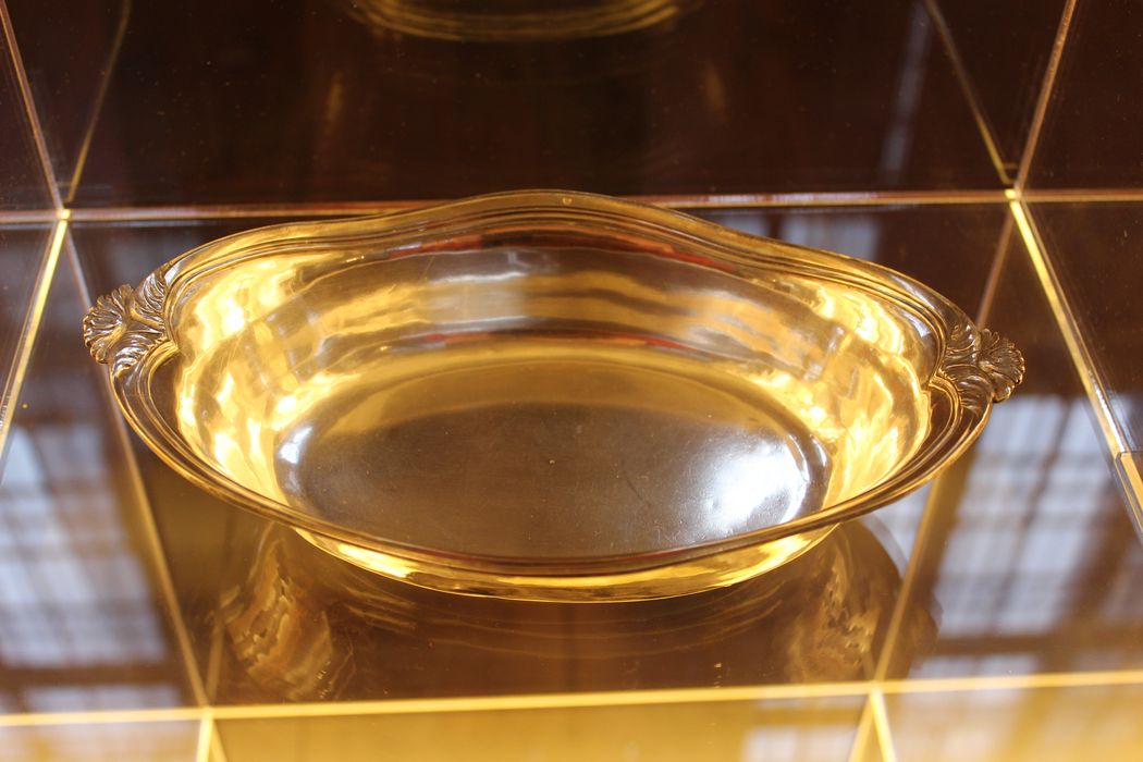 Bassin réalisé par l'orfèvre dijonnais Jean-Baptiste Brunot en 1783-1784 (cf. Les orfèvres de Bourgogne, Cahiers du patrimoine 52, n° 245) ; il est associé à des burettes contemporaines exécutées par un autre orfèvre (IM21010602) et conservé dans le même écrin.