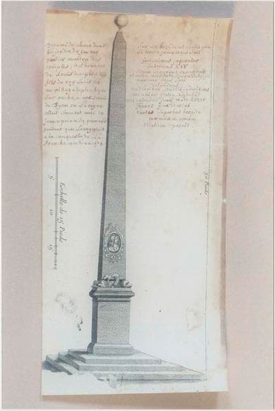 dessin et son cadre : l'obélisque élevé à Plombières-lès-Dijon en l'honneur du Grand Dauphin