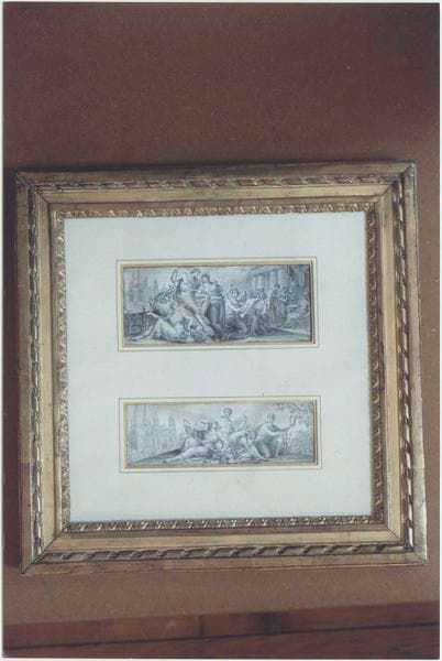 2 dessins réunis dans un cadre : projets de frontispice avec allégories