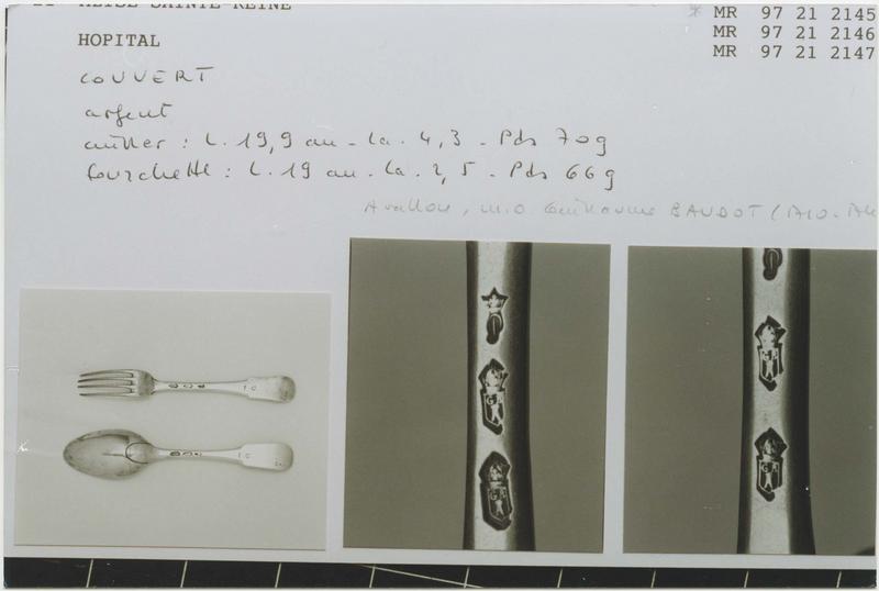 L'ensemble des objets d'orfèvrerie utilitaire, de production locale et parisienne, de l'hôpital d'Alise-Sainte-Reine ont été découverts dans un coffre. La marque de l'hôpital, visible sur plusieurs objets, a dû être posée après leur don par les malades. L'hôpital avait posé sa marque sur ces objets parce qu'ils étaient utilisés. A partir de l'usage de couverts en inox, ceux qui étaient en argent ont été délaissés et dispersés. Les objets classés sont ceux qui sont restés sur les lieux, oubliés dans le coffre. Le pèlerinage d'Alise-Sainte-Reine attirait les membres de la haute société, ce qui peut expliquer la présence, également, d'orfèvrerie parisienne. En revanche, l'oeuvre de certains orfèvres bourguignons ne nous est connue que par les objets de l'hôpital d'Alise-Sainte-Reine. Orfèvre : Guillaume Baudet, Avallon, 1710-1784.
