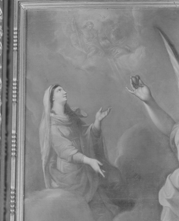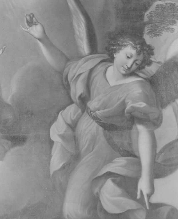 Toile (support, en trois lés) : peinture à l'huile ; bois : taillé, peint, noir, doré ; stuc : moulé, doré ; Trois lés horizontaux (une couture dans la partie inférieure au-dessus du pied de l'enfant, une autre au milieu au niveau du coude gauche de l'Ange) ; châssis à un montant et une traverse ; moulure externe du cadre en stuc rapporté (feuillage).