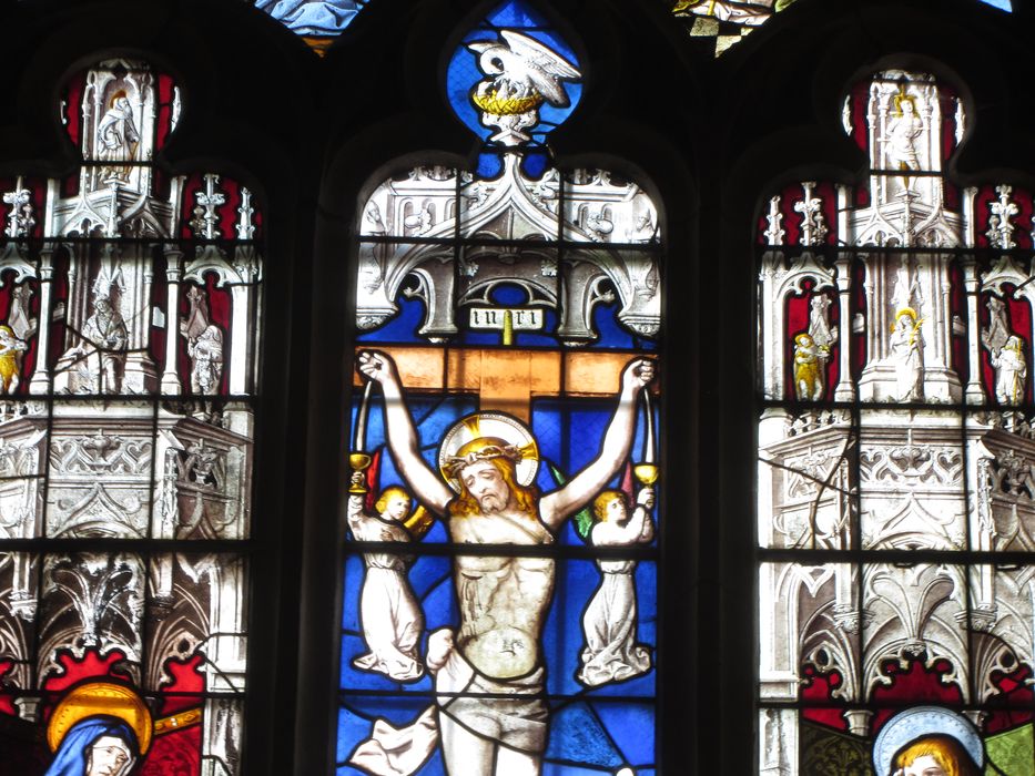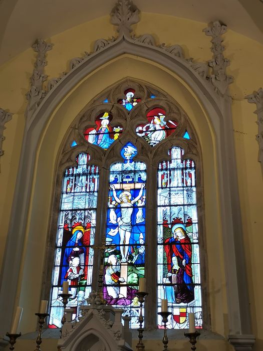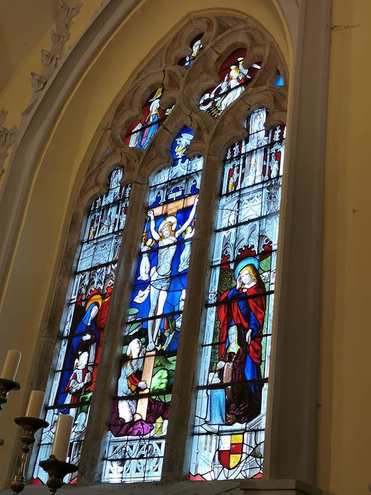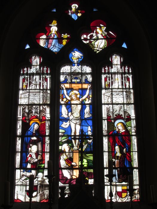 Grand vitrail divisé en trois parties. Au centre la Crucifixion entre la vierge et saint Jean, à droite et à gauche les donateurs, un seigneur et son épouse à genoux accompagnés de leurs saints patrons.