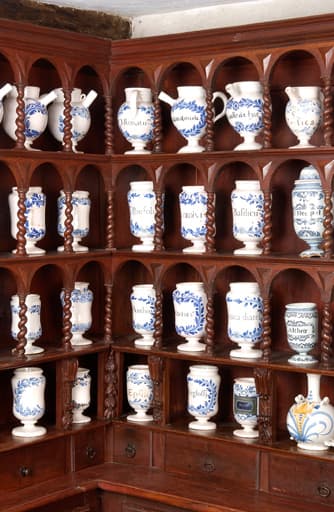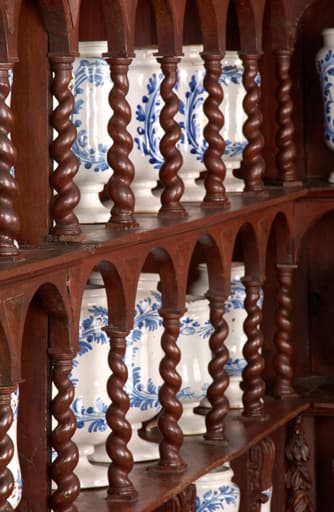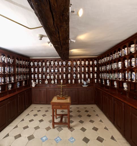 Le corps inférieur du meuble couvrant les murs de la pièce est composé de placards fermés par des portes. Le corps supérieur comporte un niveau de tiroirs et quatre niveaux d'étagères formées de fausses niches à colonnettes torses abritant des pots à pharmacie. Un autre meuble prend la forme d'un buffet : la partie inférieure présente deux tiroirs et deux placards fermant par un battant, tandis que la partie supérieure est constituée de deux rangées de fausses niches à colonnettes torses.