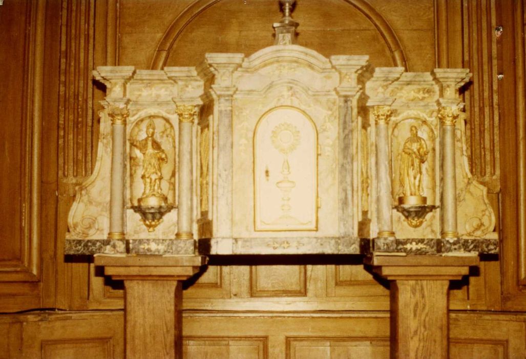 Tabernacle dont la partie centrale, en saillie, présente une porte ornée d'une représentation d'ostensoir. Les sections latérales offrent deux niches abritant des statuettes, cantonnées de colonnes et augmentées d'ailerons en volute.