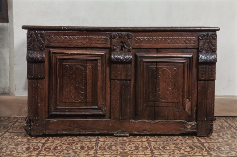 Coffre présentant des consoles et orné de pennes et de motifs végétaux.