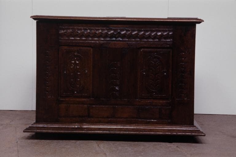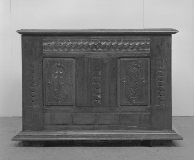 chêne : taillé (décor en bas-relief) ; fer (garniture) : forgé