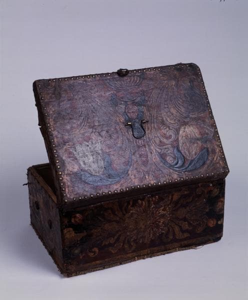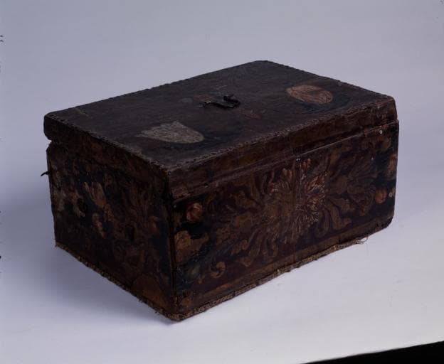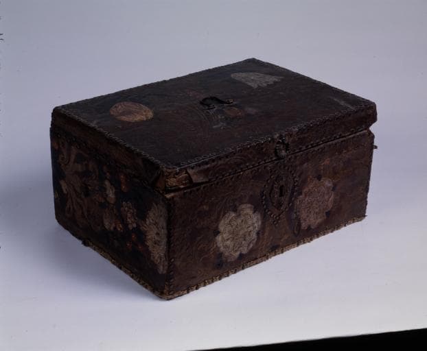 sapin (structure, intérieur) : taillé ; cuir (garniture, extérieur) : cloutage décoratif, gaufré, peint ; papier (garniture, intérieur) ; bronze (garniture) : fondu