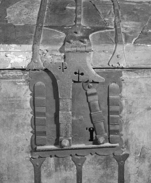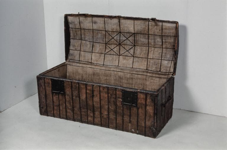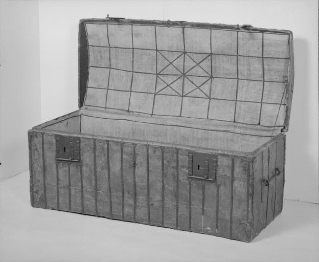 sapin (structure, intérieur) : taillé ; peau (garniture, extérieur) : peint ; matériau textile (garniture, intérieur) : toile ; fer (garniture) : forgé, découpé, décor poinçonné