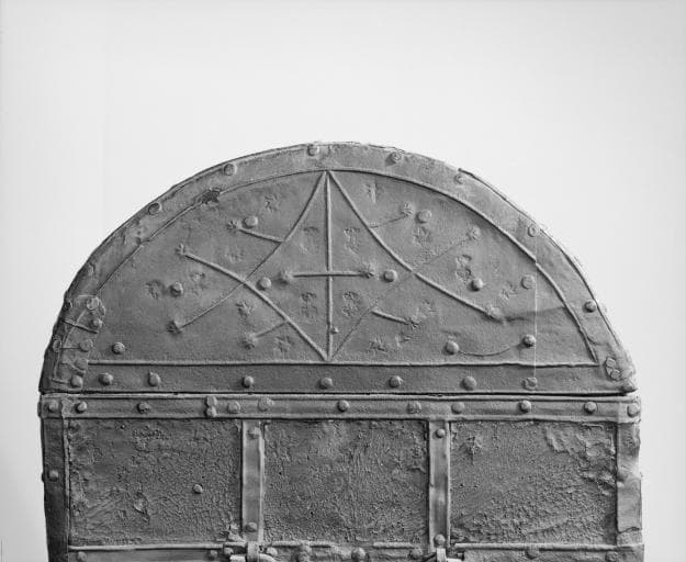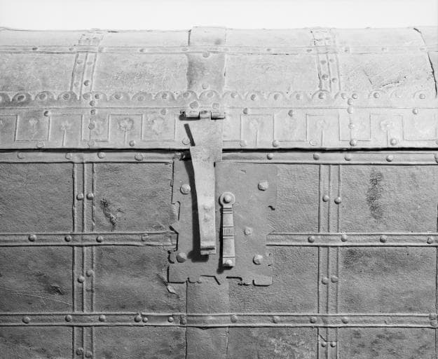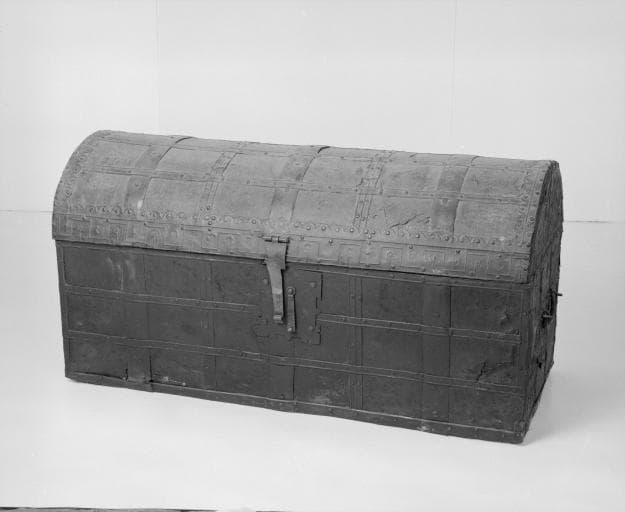 hêtre (structure, intérieur) : taillé ; cuir (garniture, extérieur) ; matériau textile (garniture, intérieur) : toile ; fer (garniture, extérieur) : forgé, poinçonné motif en creux, repoussé