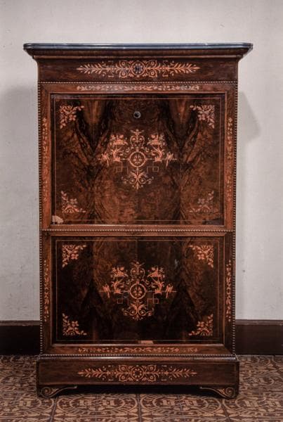 noyer (structure, extérieur) : taillé, placage, frisage ; vernis ; bois blanc (structure, extérieur) : taillé, marqueterie à incrustations ; chêne (structure, intérieur) : taillé ; sycomore (structure, intérieur) : taillé, placage ; marbre veiné (gris) : taillé, poli ; bronze (garniture)