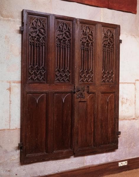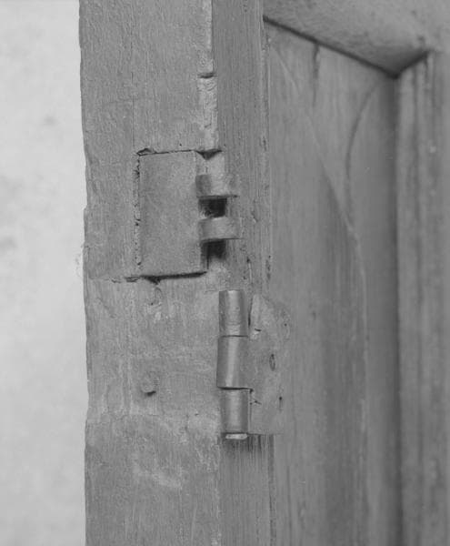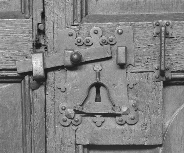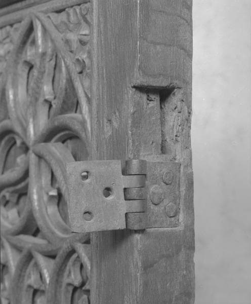 chêne : taillé, mouluré petit cadre, orbevoie ; fer (garniture) : forgé, découpé, repoussé