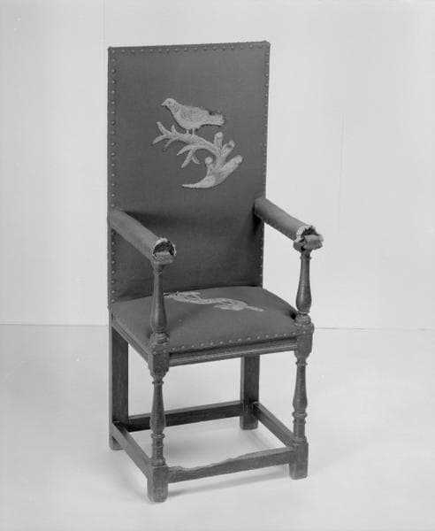 chêne : taillé, mouluré petit cadre, tourné ; vernis ; matériau textile (garniture) : brodé