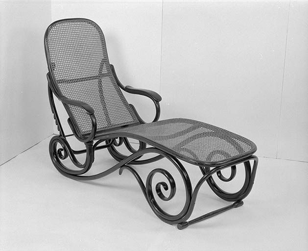 hêtre : taillé, courbé, teint (foncé) ; vernis ; fer (garniture) ; jonc (garniture) : cannage