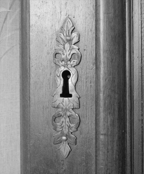 noyer : taillé, tourné, grand cadre vrai, mouluré petit cadre ; fer (garniture) : forgé, gravé