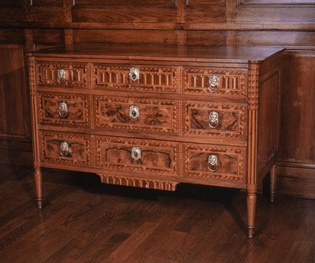 noyer (ronceux) : taillé, tourné, placage ; bois fruitier : taillé ; bois : marqueterie à filets composés ; fer (garniture) : forgé ; bronze (garniture) : fondu