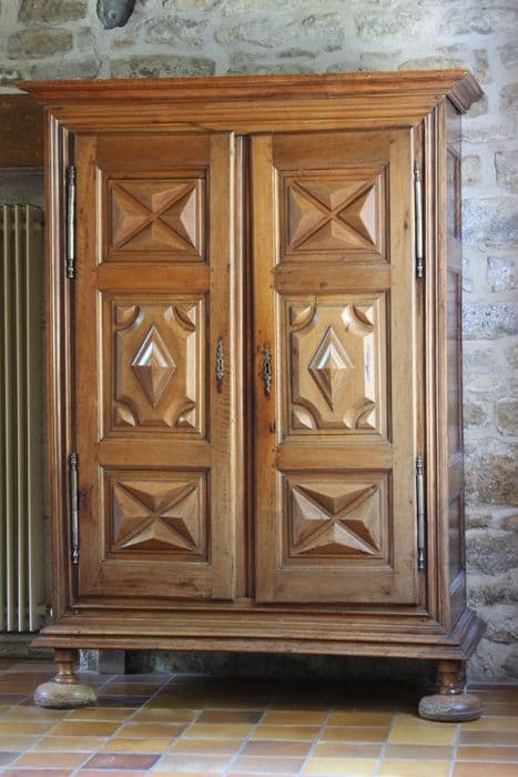 Armoire en noyer (façade et côté droit) et chêne (côté gauche), fermée à clé.