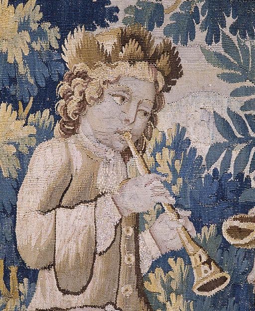 jeunes gens : danseur, musicien, fond de paysage ; rinceau ; fleur ; feuille ; oiseau