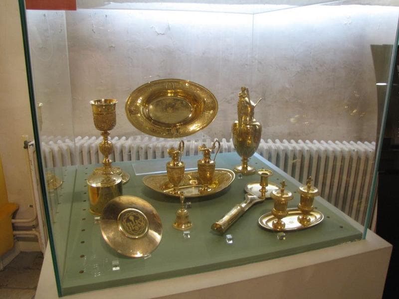 deuxième chapelle épiscopale du cardinal de Clermont-Tonnerre : calice et patène, burettes et leur plateau, aiguière et bassin à ablutions, ampoule aux saintes huiles, ampoule à saint chrême et plateau, boîte à hosties, clochette et bougeoir pontifical