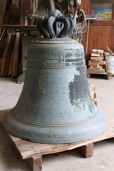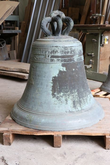 grosse cloche : inscription très lisible, note : La. Moyenne cloche : inscription, note : Fa