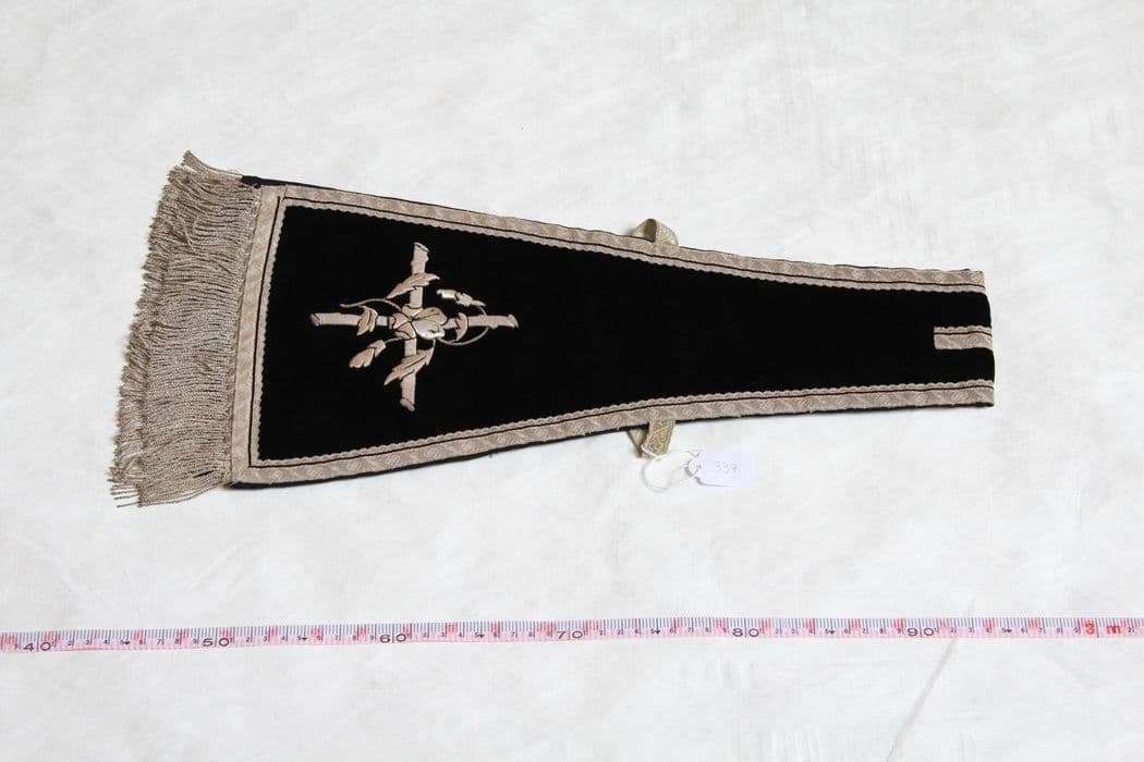 Guirlande appliquée de fleurs brodées en fil d’argent dessinant une croix ; petit galon argent ; étiquette tissée