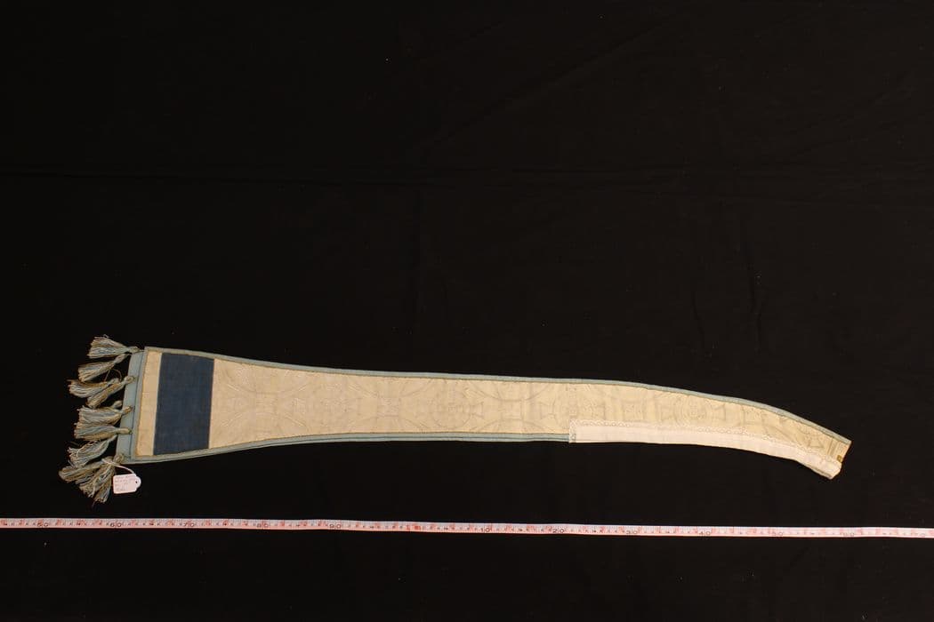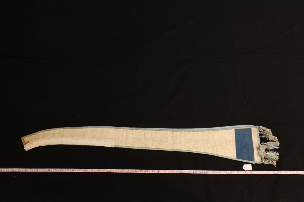 A décor de croix inscrit dans des cercles sécants ; croix formée par un galon or ; bande de velours bleu et monogramme « AM » brodé en fil d’or et rayons en paillettes or ; doublure en satinette bleu clair ; étiquette tissée M.