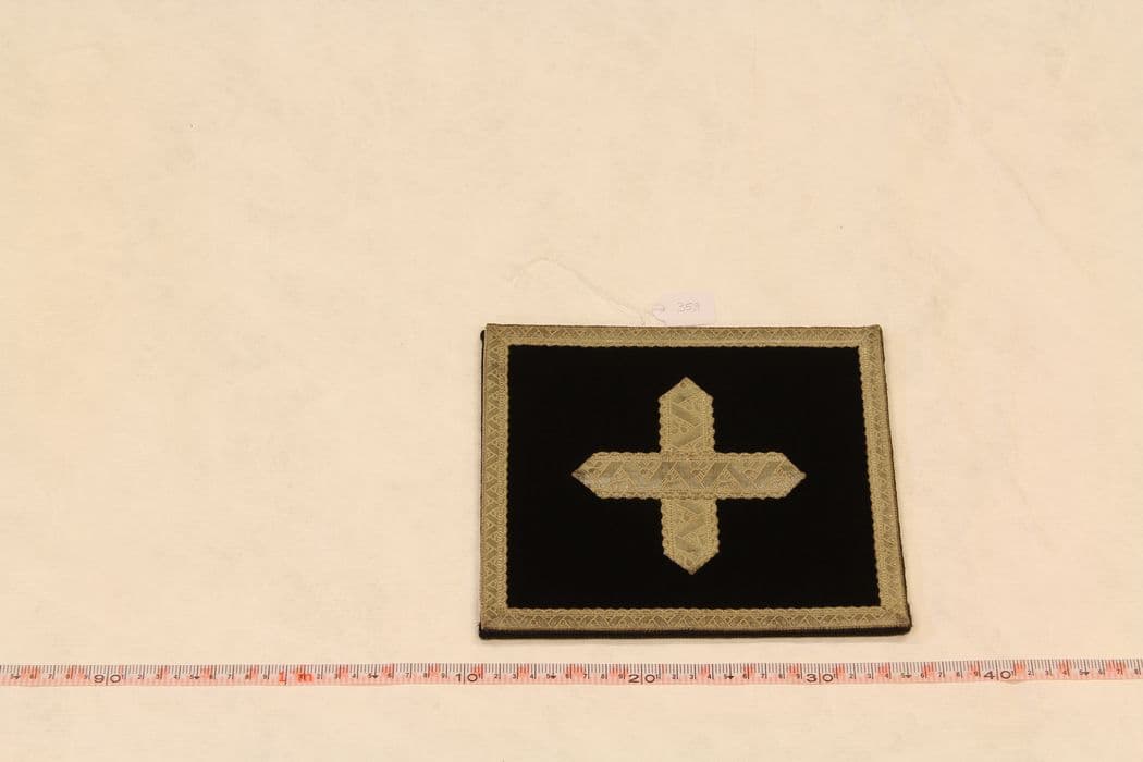 Galon argent ; croix formée par un large galon argent ; « IHS » avec des entrelacs, des quatre feuilles et des chardons en fil d’argent rehaussé de cabochons de métal, le tout appliqué.