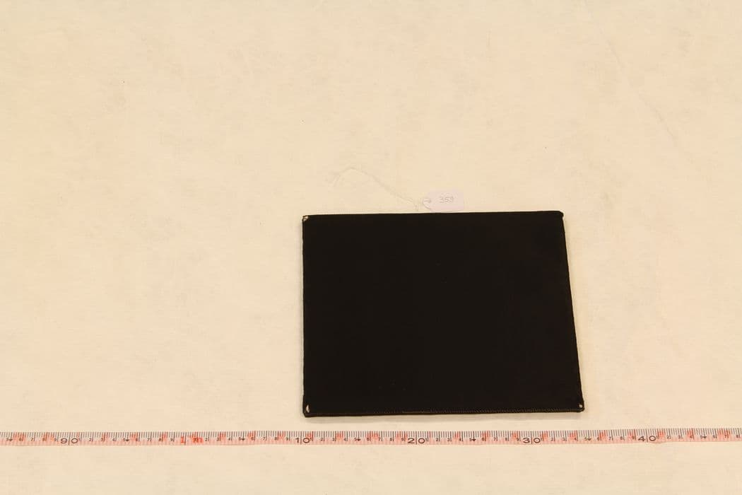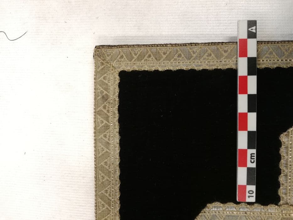 Velours poussiéreux, les coins sont émoussés et s’effilochent. À l’intérieur, il y a des taches jaunes et deux fois l’inscription « 1 » au crayon à papier. Plis de stockage au niveau des soufflets. Fil du galon commence à s’oxyder.