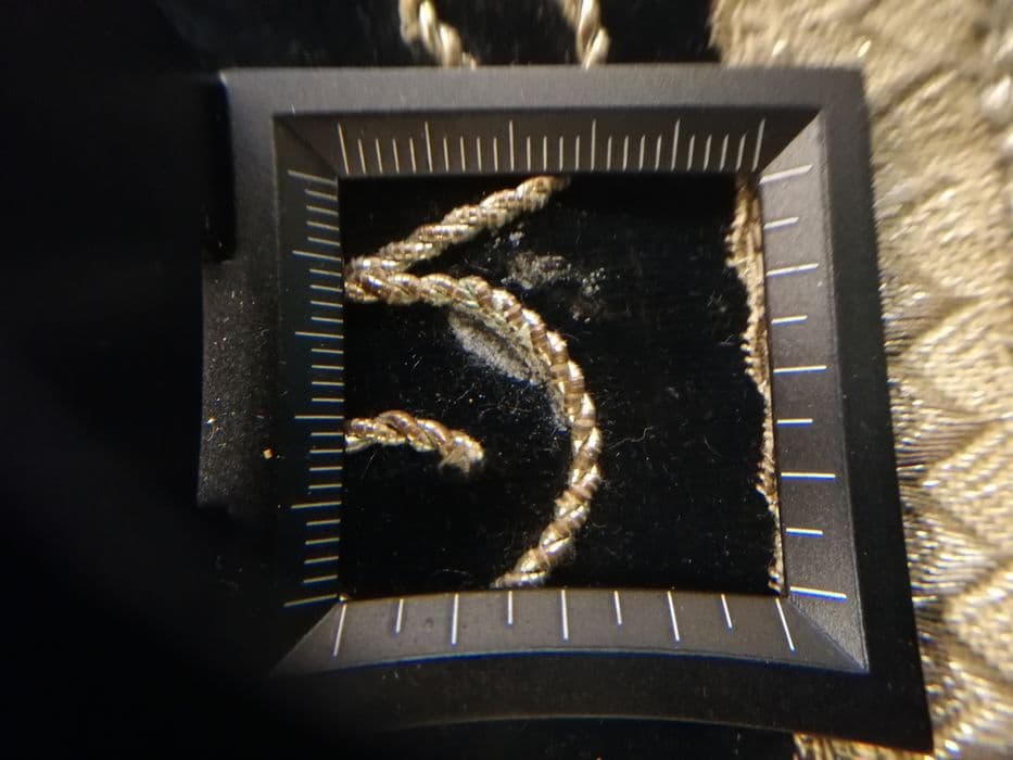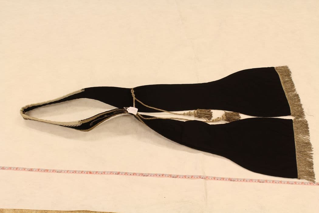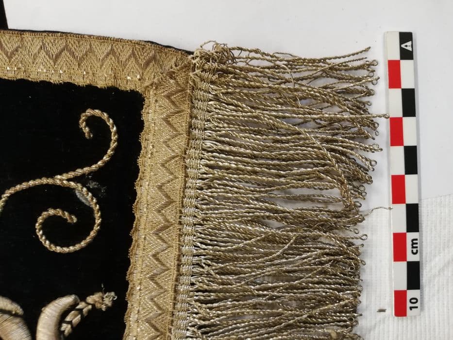 Les franges en filé argent s’effilent. Il y a de la cire sur le velours et sur les broderies. Les broderies s’effilochent et commencent à s’oxyder. Les cabochons sont soit manquants soit affaissés. La broderie s’effiloche, la ganse s’effiloche, il manque des sequins. Le col est encrassé avec des plis de stockage. Le galon s’oxyde. Plis de stockage sur la doublure et écrasement de celle-ci.