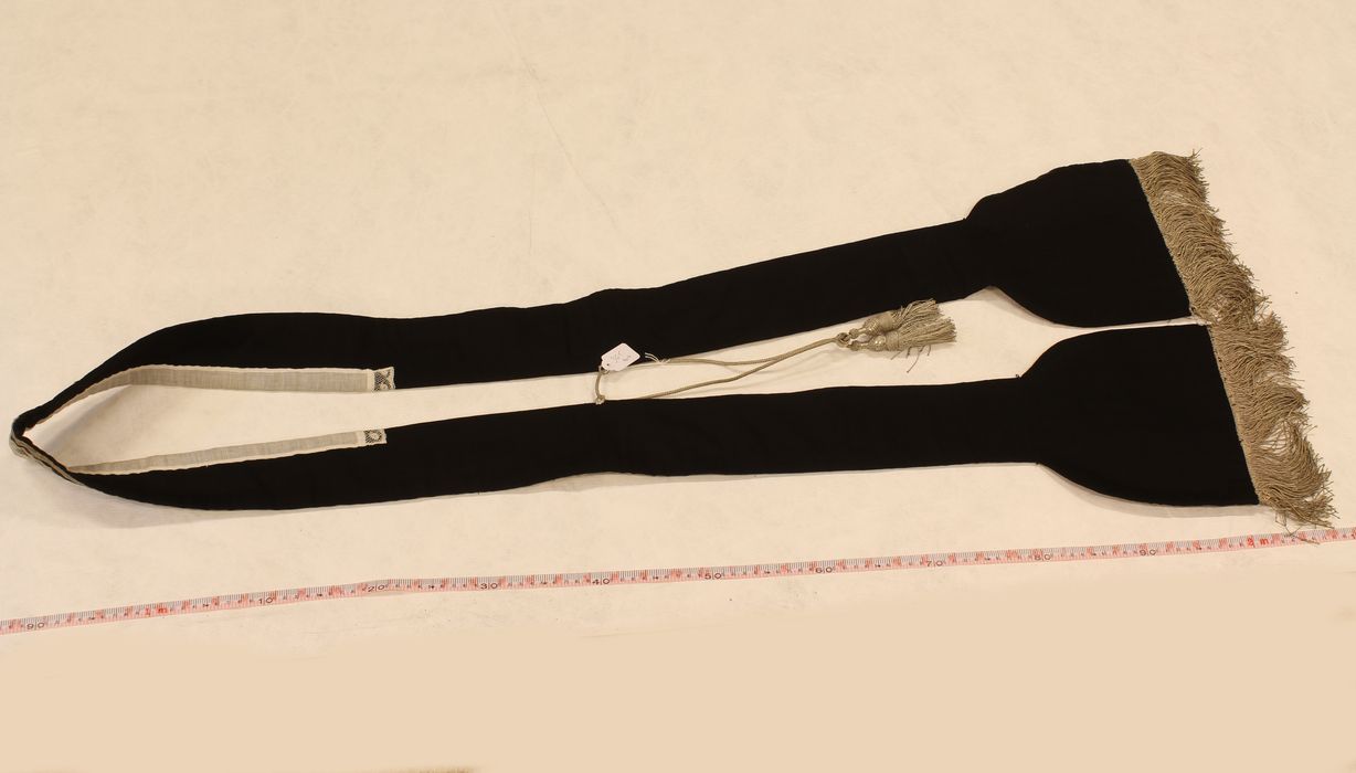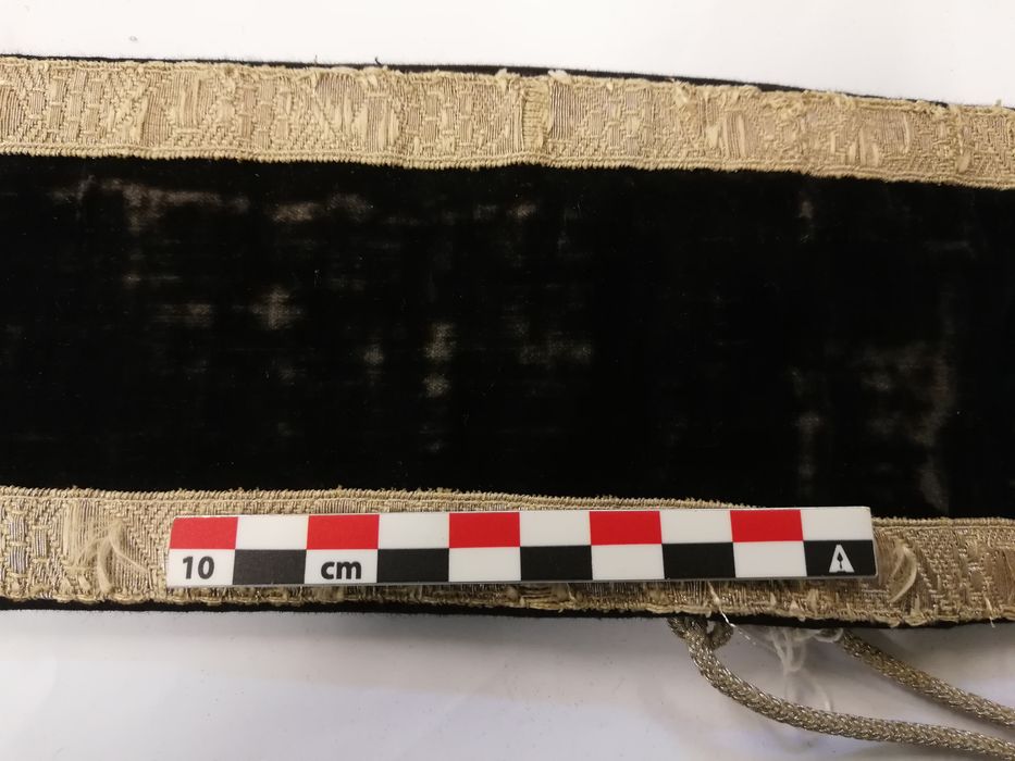 Le velours est râpé, a des plis de stockage et est écrasé. Le galon s’effiloche à beaucoup d’endroits. Les franges en filé argent s’effilent, laissant paraître l’âme en coton. Les attaches du gland ont été refaites. Cocon de mite. Le col est encrassé et a des plis de stockage. Doublure : petit accroc de fil, plis de stockage.