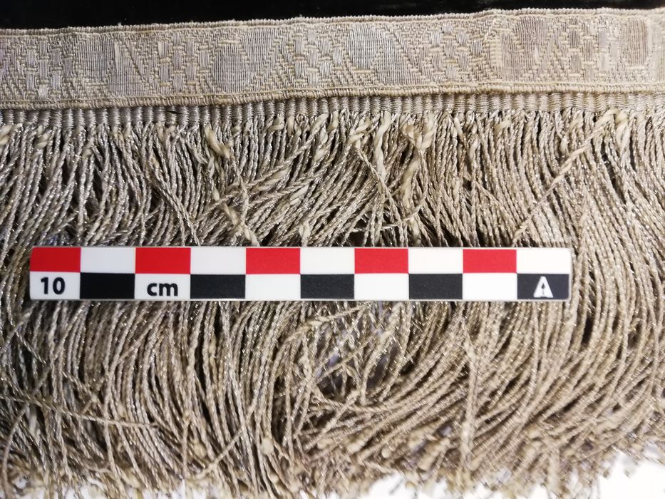 Galon et franges en filé argent ; cordon et glands en filé argent ; doublure en satinette de coton noir.