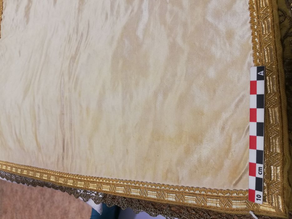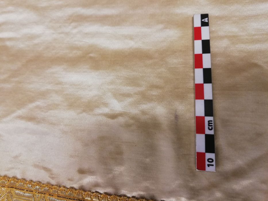 Bordure élimée, pli médian, taches sur le satin. Résidus de bois sur l’objet. Coin émoussé sur la doublure, plis de stockage, taches et moisissures.