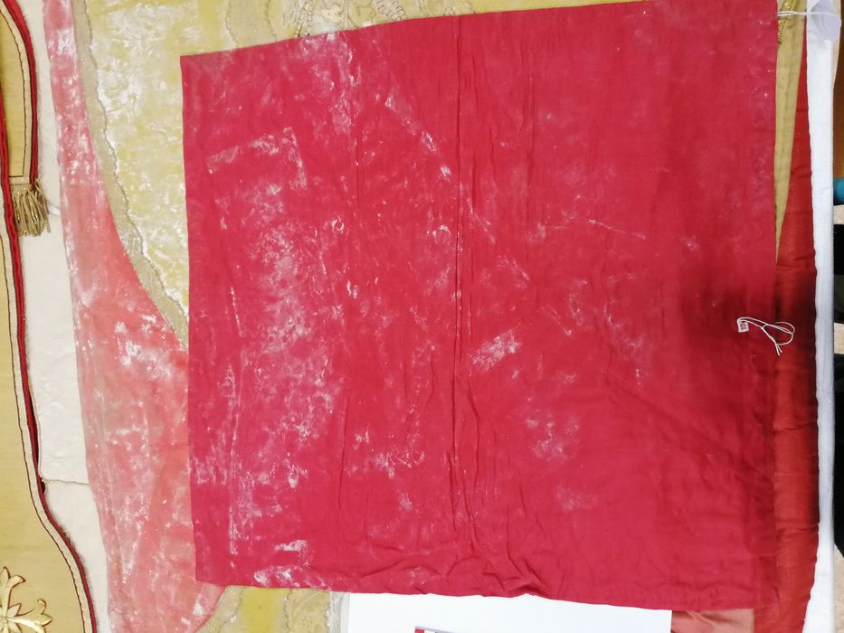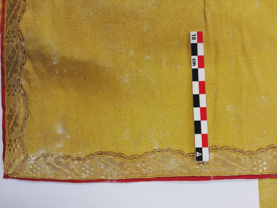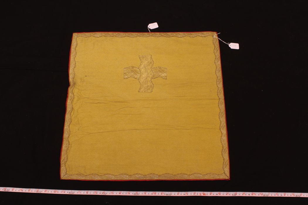 Guirlande de fleurs appliquée en fil d’or ; au dos croix en guirlande de fleurs inscrites dans des médaillons polylobés avec, au centre, les cœurs de Jésus et de Marie brodés de cannetille sur un fond tissé en fil d’or ; galon or ; franges en cannetille or ; doublure en satinette de coton rouge ; étiquette tissée 15