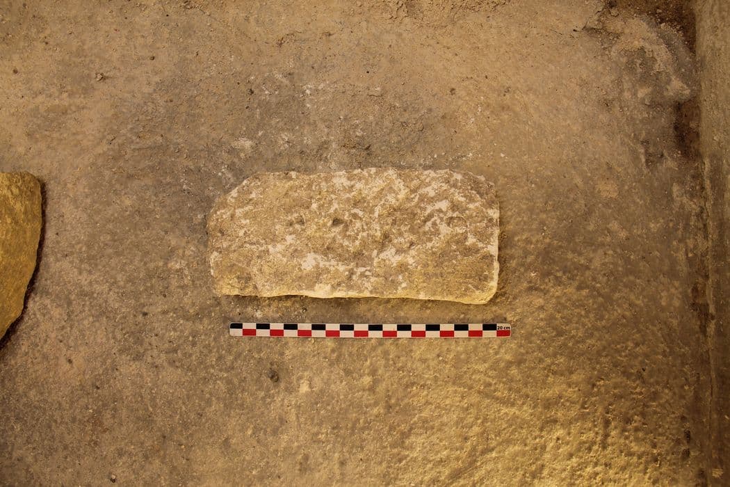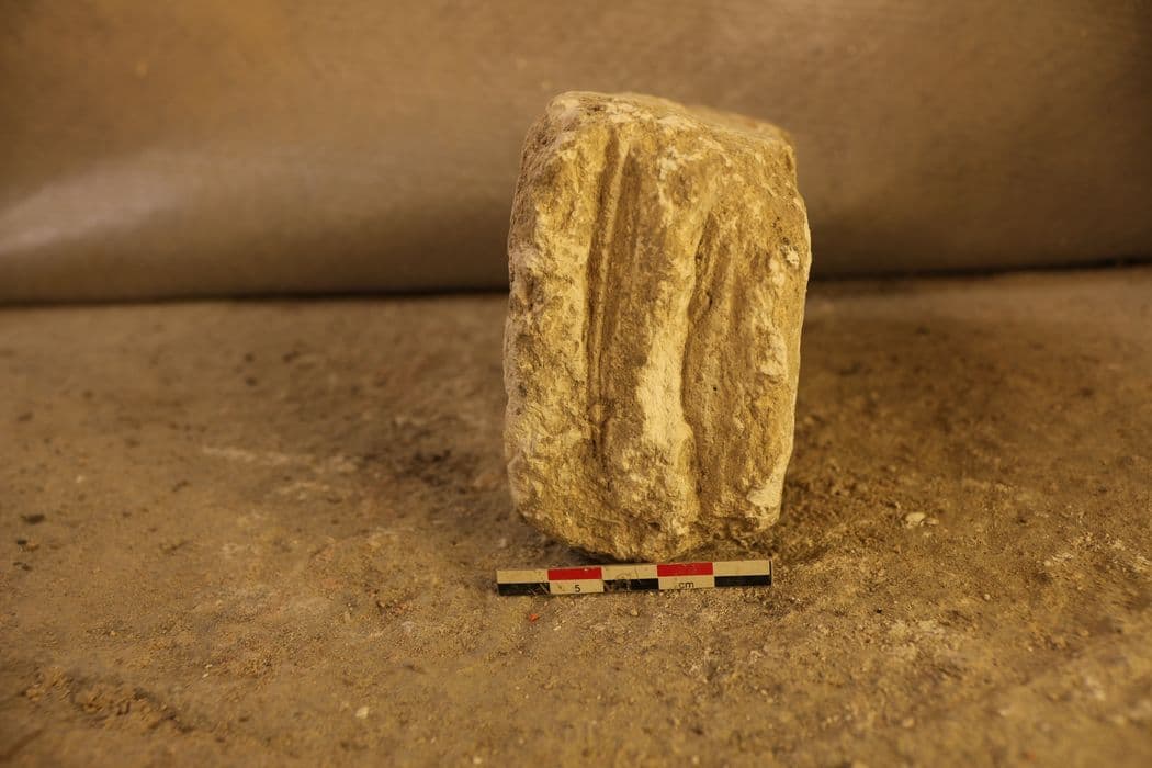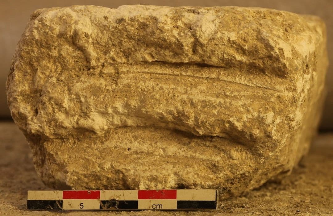 Ce bloc quadrangulaire présente deux marques profondes parallèles pouvant être rapprochées de celles de l'élément LA-031. Il pourrait s'agir de restes de deux tores de diamètres différents. Il provient de la fouille de la citerne installée dans la partie nord-ouest des cryptes.