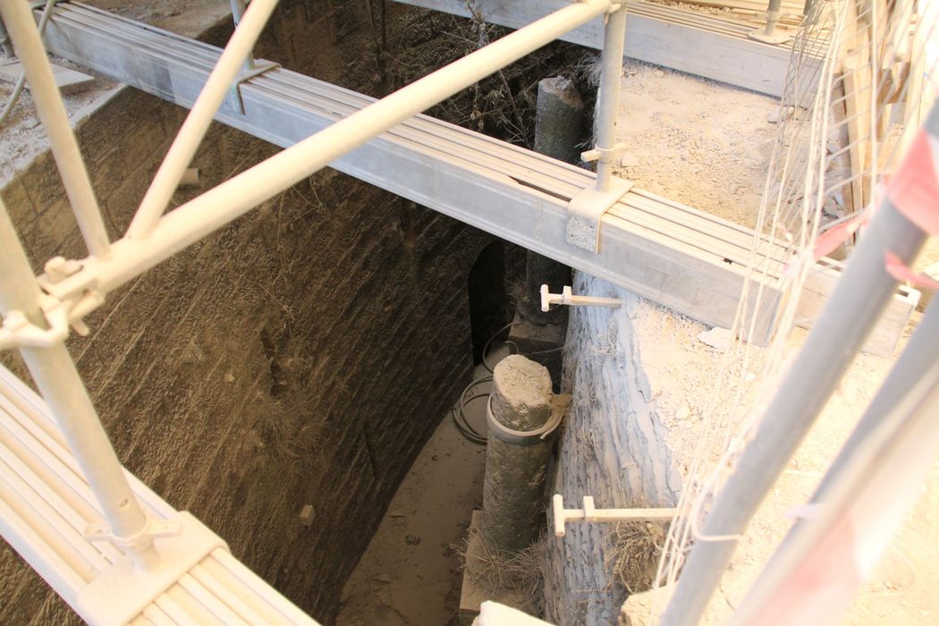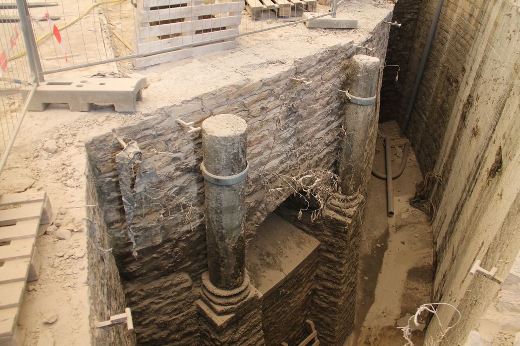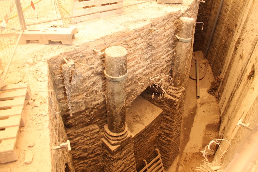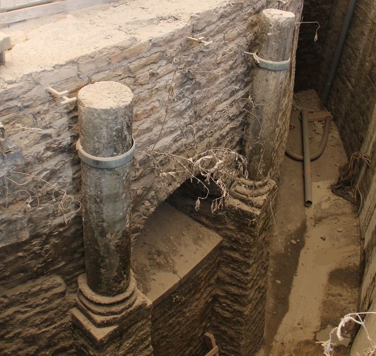 Ces colonnes à bases carrées surmontées de deux moulures séparées par une scotie ont été retrouvées lors du creusement des fossés d'assainissement (sauts de loups) autour de la rotonde en 1890 (CACO 1889-1895 : XXIX-XXX, LXXIII). D'après Louis Chomton, "ces colonnes formaient sans doute de simples étais sous d'autres qui cantonnaient deux absidioles en encorbellement dépendant de la rotonde du milieu et renfermant les autels de saint Jean l'évangéliste, au midi, et de saint Mathieu, au nord" (Chomton 1900, p. 105).