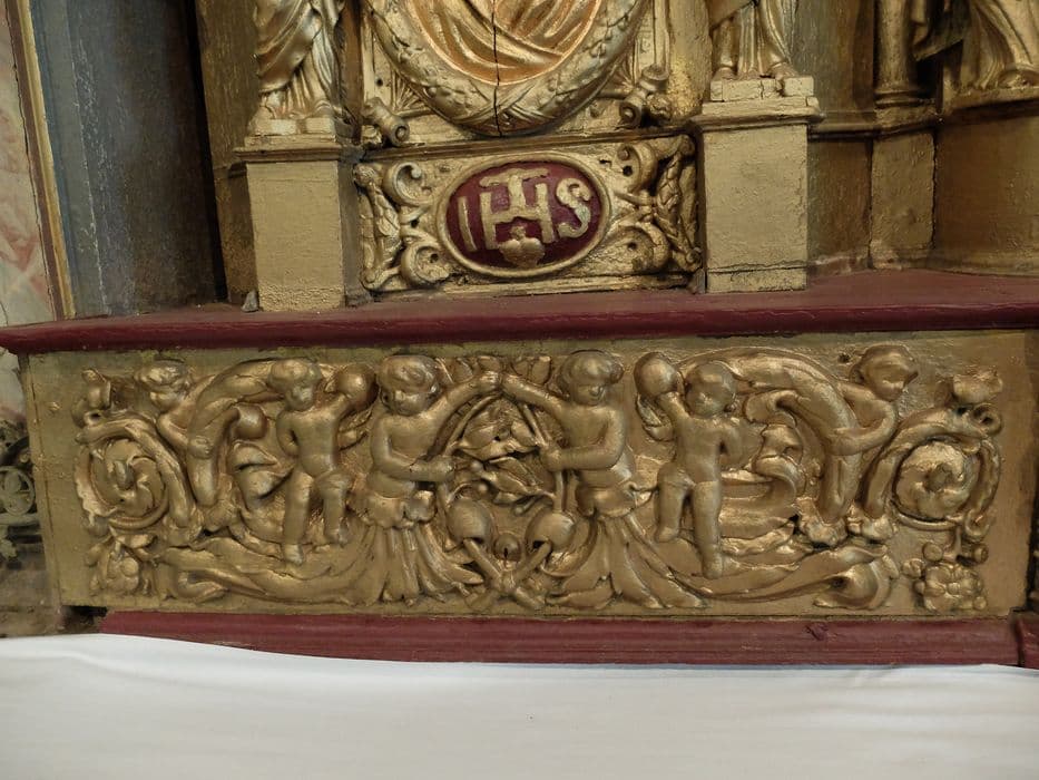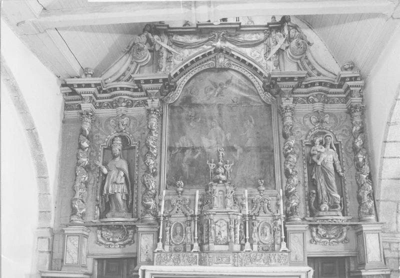 Ensemble comprenant un petit retable en bois doré et un grand retable polychrome. Le petit retable est décoré de colonnes torses, de médaillons, de statuettes, de guirlandes et de pots à feu. L'amortissement du tabernacle est couronné d'une sculpture. Le tableau du grand retable est flanqué de deux sections latérales entre des colonnes torses enroulées de pampres et de grappes.
