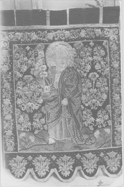 Sur une face, motif en drap d'or appliqué sur velours vert avec broderies appliquées en fils d'or et d'argent. Bordure avec rinceaux. Cinq lambrequins avec franges et broderies en fils d'or et d'argent. Sur l'autre face : motif en drap d'or appliqué sur velours rouge, bordure de rinceaux, broderies sur les lambrequins. L'un des deux cordons de soutient subsiste. Il est terminé par un gland d'or à franges.