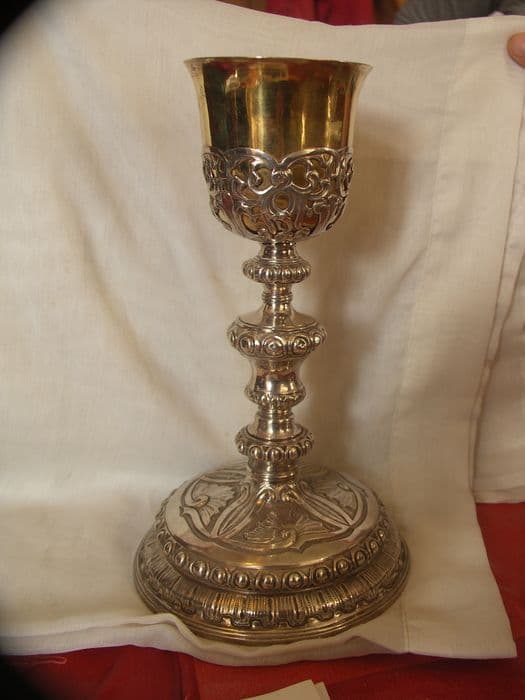 Calice en argent et patène en vermeil. Base du calice décorée de raisins et d'épis. Noeud et tige Louis XV à ornementation d'oves. Fausse coupe ajourée.