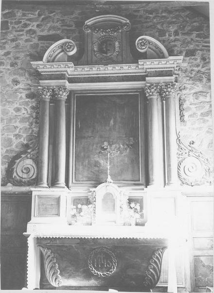 Des colonnes jumelées encadrent le tableau central. Le fronton est orné d'un écusson. Le retable est flanqué d'ailerons sculptés. La porte du tabernacle est un miroir.