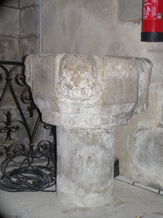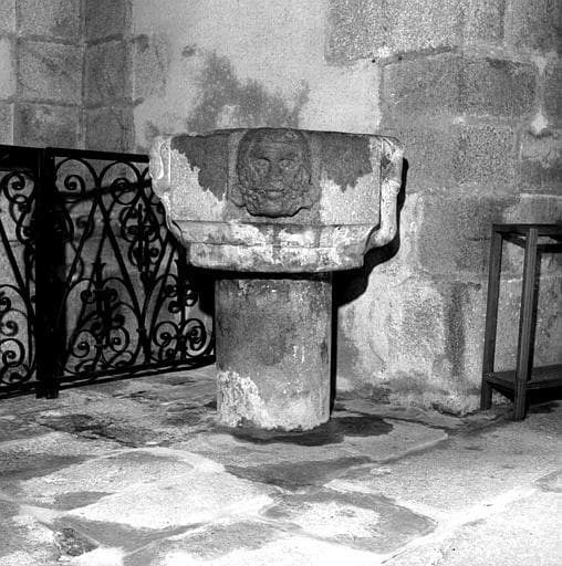 Bénitier présentant quatre mascarons sur les pan coupés d'un carré.