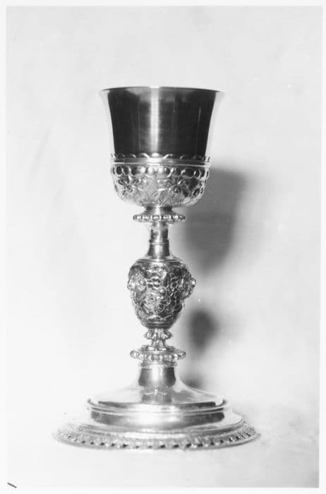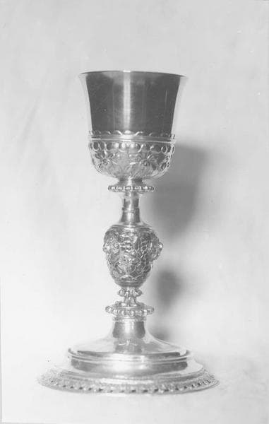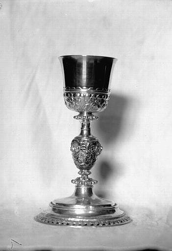 Ccalice en argent avec coupe en vermeil. Base aux feuilles d'acanthe repercées. Collerette godronnée. Noeud un peu allongé. Fausse coupe à oves et décor de fruits. Patène unie avec traces de poinçons anciens.