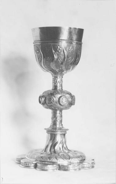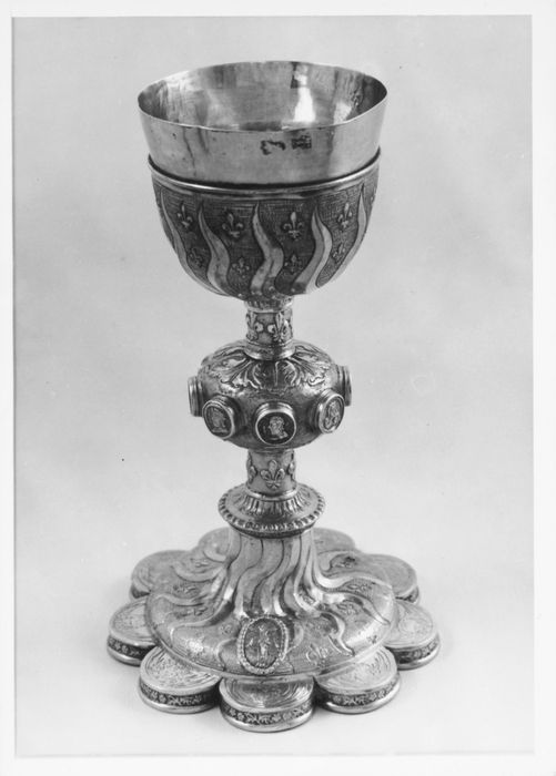Poinçon : initiales HA séparées par un lion passant, surmontées d'une fleur de lys couronnée entre deux grains de remède (sur le rebord de la coupe). Poinçon : lette G couronnée (sur le rebord de la coupe).