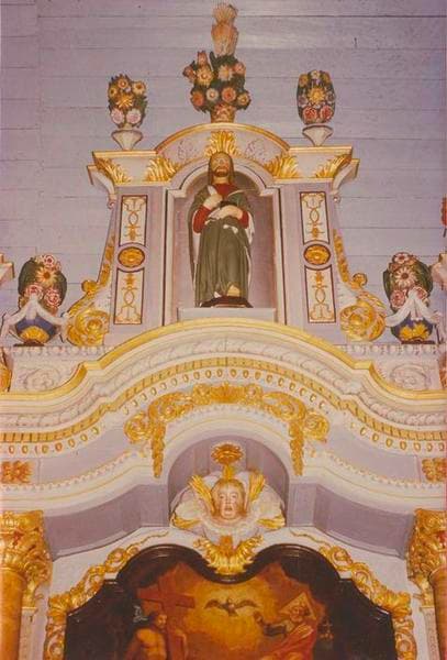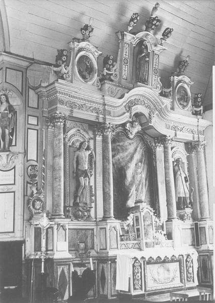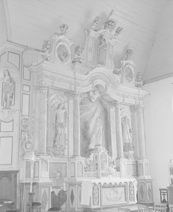 Le devant de l'autel présente des chutes de fleurs sculptées de chaque côté d'un motif peint. L'emplacement du tabernacle est occupé par une niche vitrée abritant une statue. Les niches latérales sont cantonnées de pilastres cannelés et de colonnes. Au-dessus de l'entablement, un fronton central couronné de pts à fleurs. Les petits frontons latéraux sont flanqués et surmontés de pots à fleurs avec des médaillons peints.