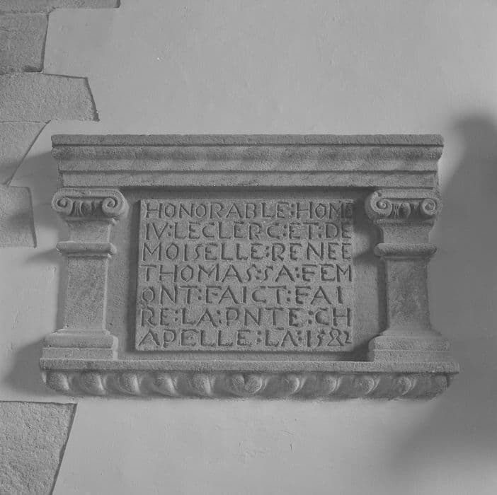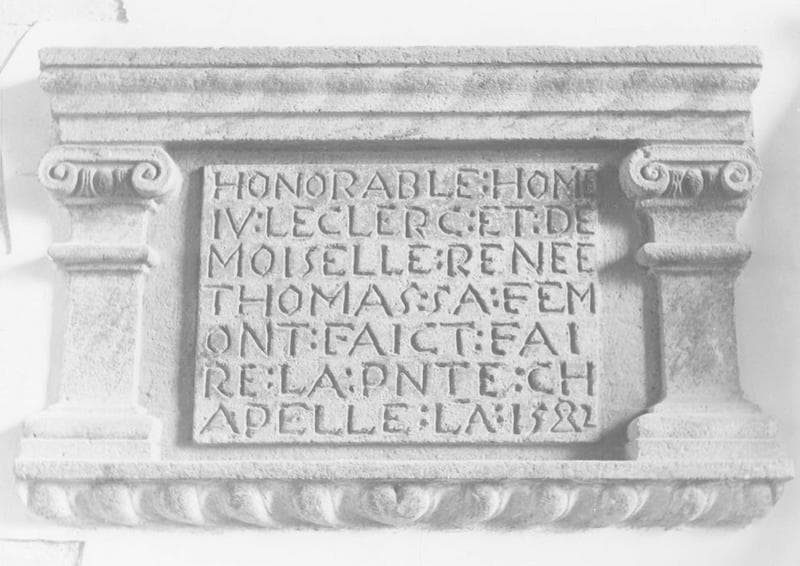 Inscription commémorative de la construction d'une chapelle, entre deux pilastres à chapiteaux ioniques.