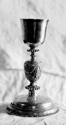 Base aux feuilles d'acanthe repercées. Noeud un peu allongé à guirlandes. Collerettes godronnées.
