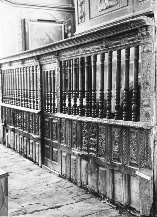 Clôture comprenant un registre inférieur composé de petits panneaux pleins. Le premier registre est surmonté d'un second couvert de sculptures. Au-dessus, s'élève une rangée de 28 colonnettes qui soutiennent une corniche. Les extrémités de la clôture et les côtés de la porte présentent de petits pilastres.
