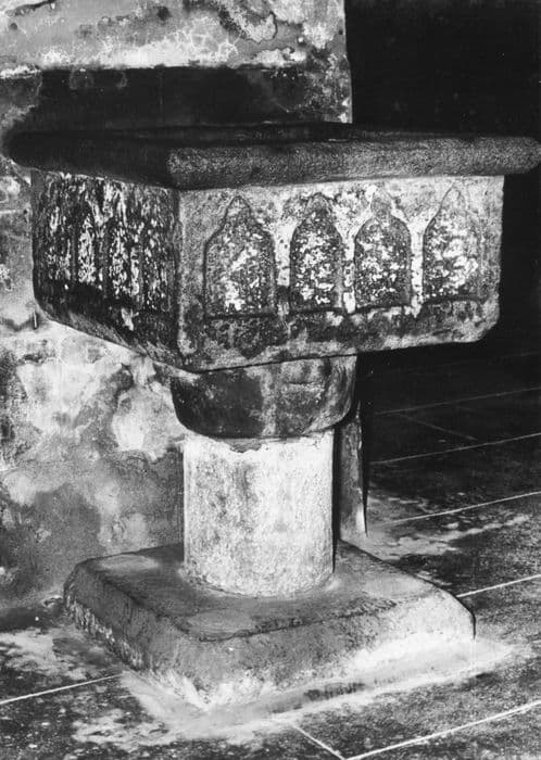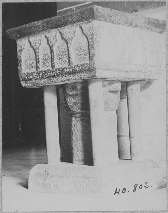 Cuve de section carré, reposant sur une colonne à gros chapiteau.
