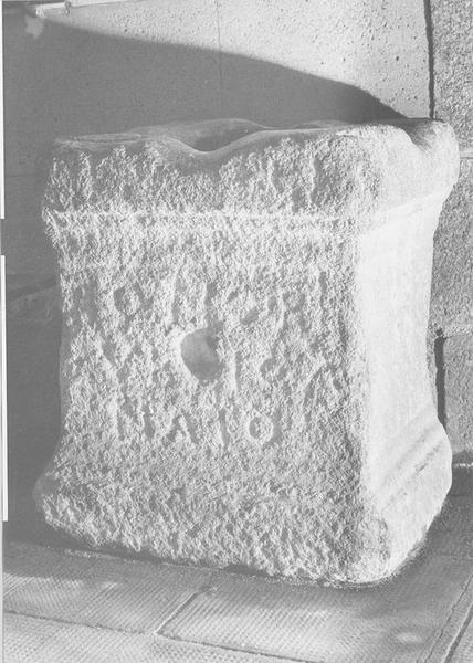 Fragment de borne millière militaire, monolithe, composée d'un dé rectangulaire supportant un chapiteau rectangulaire et supporté lui-même par une base analogue au chapiteau. Sur la face supérieure, on voit un trou cylindrique où s'insérait sans doute le milliaire.
