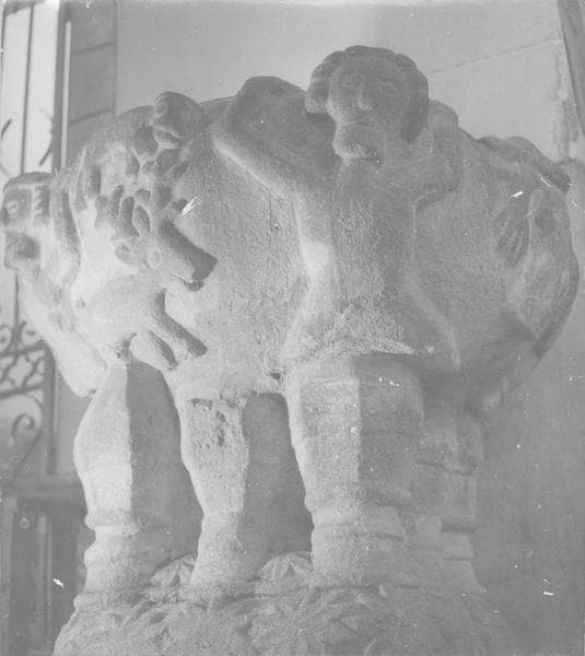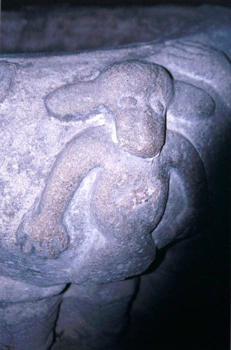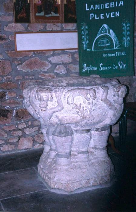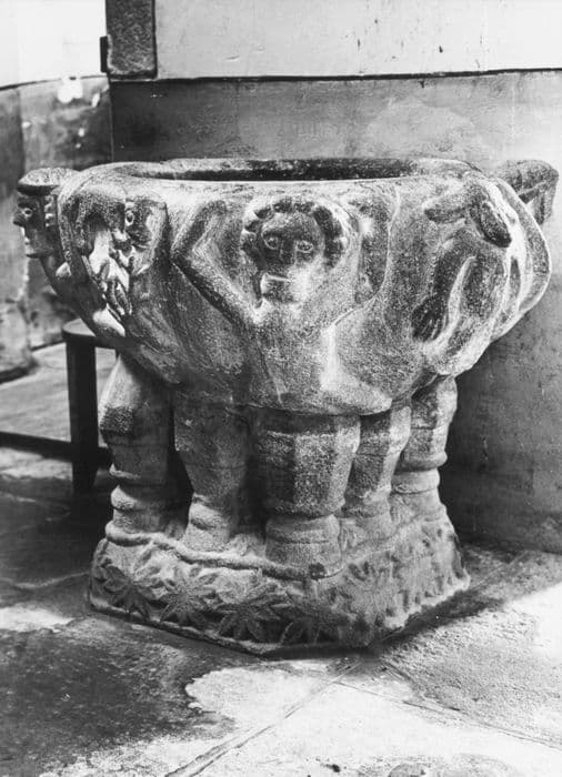 La cuve, de plan circulaire, est décorée d'animaux et de quatre personnages aux bras le vés. Elle repose sur huit chapiteaux placés directement sur des socles. La base est ornée de fleurs.