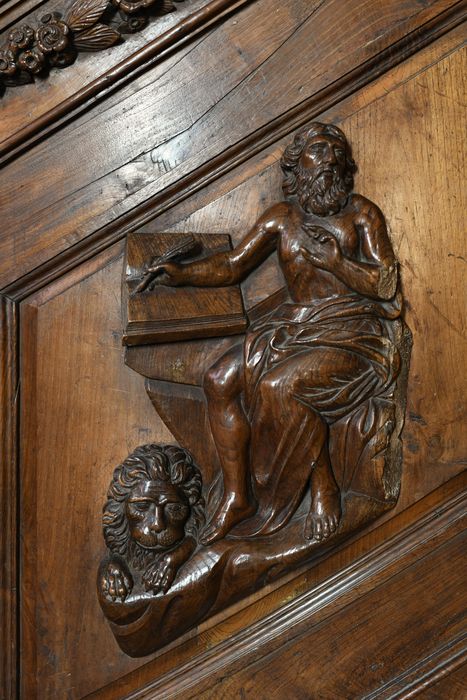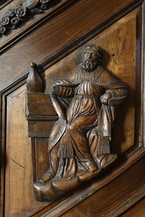 Personnages sculptés sur les panneaux et en relief aux angles.